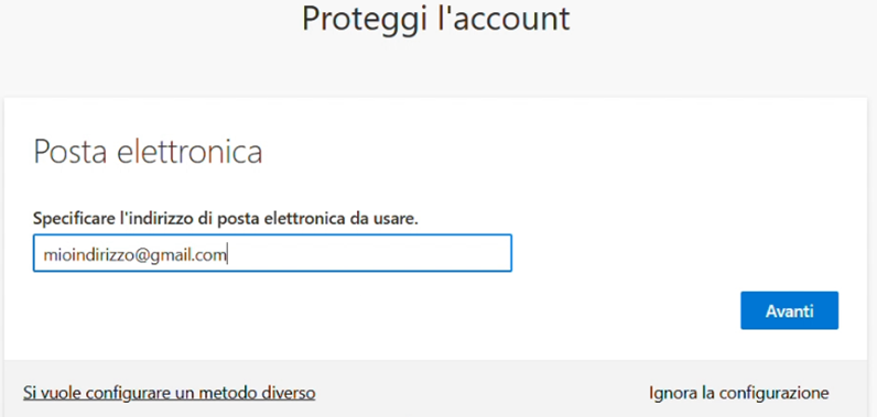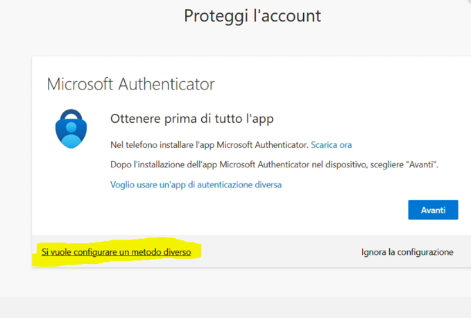 Verrà proposta l’installazione dell’app Microsoft Authenticator. Per utilizzare un metodo alternativo, fare clic su Si vuole configurare un metodo diverso (in basso a sinistra).